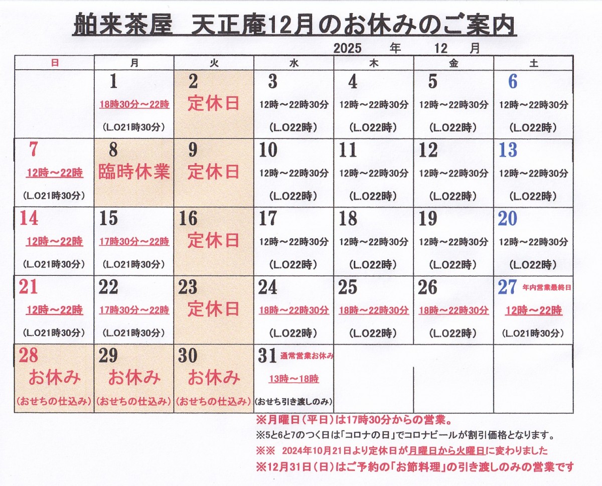 2025年12月31日はおせちなどの、ご予約商品の引き渡しのみとなります。