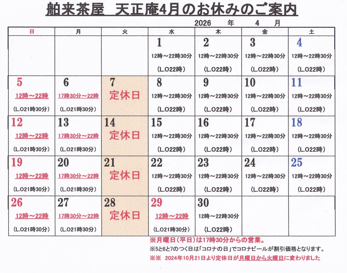 今月の営業カレンダー(4月1日改正)