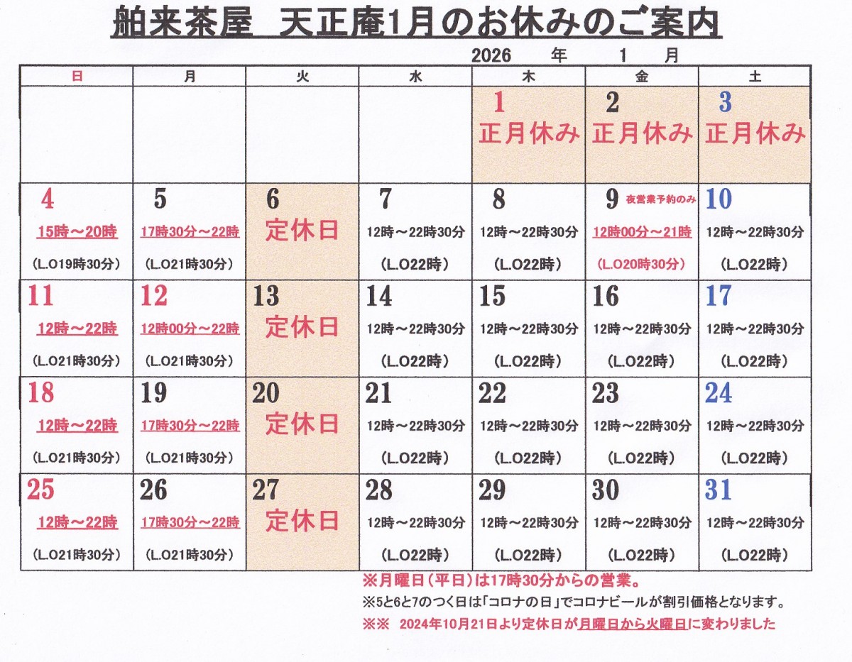 2026年1月9日(金)の営業は、18時以降はご予約のみの営業となります。