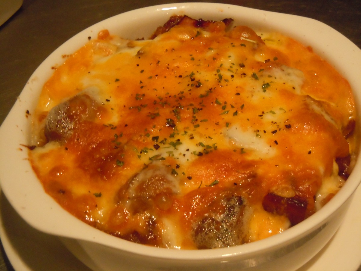 牛肉とポルチーニ茸、国産マッシュルームを使った赤ワイン仕込みのハヤシソースをベースに、自家製スモークベーコンと牡蠣の燻製を重ね、2種のチーズを載せて焼き上げた逸品です。