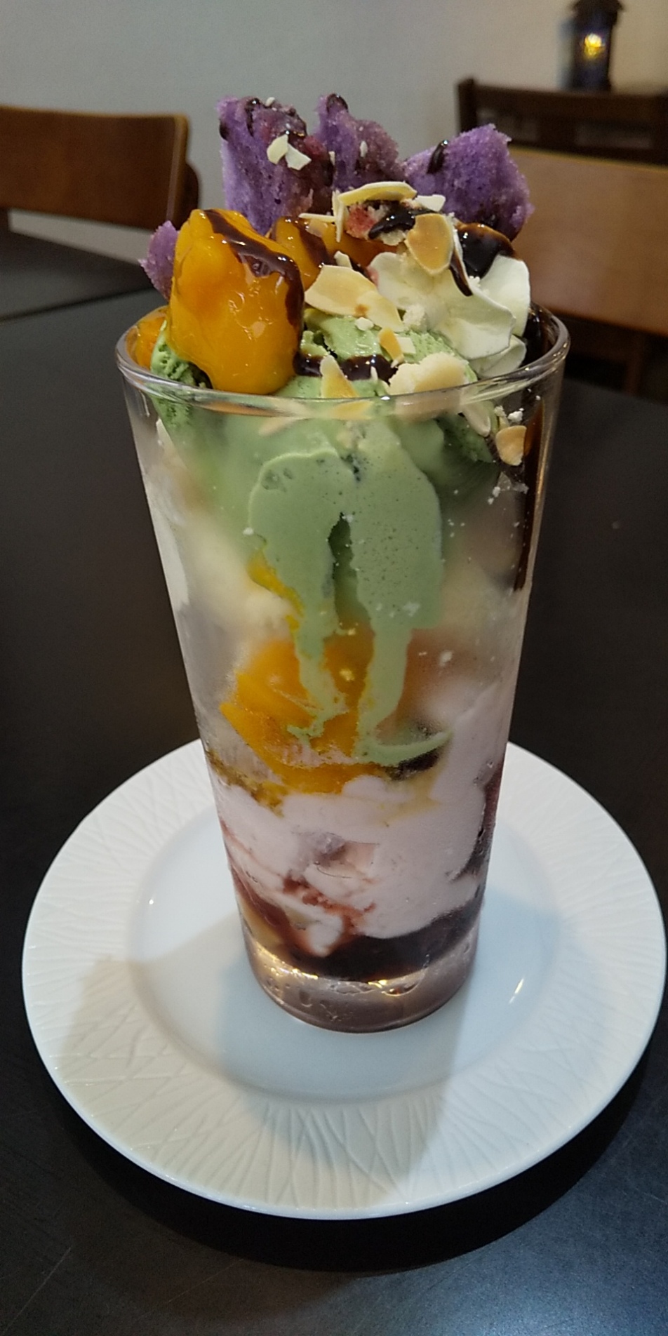 季節のパフェ(現在は自家製サーターアンダギーマンゴーのパフェ) ¥980(15時からのメニューとなります)